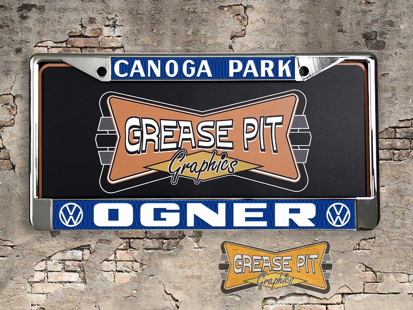 A newly produced vintage style Ogner Volkswagen VW Canoga Park California reproduction dealership license plate frame for your Hot Rod, Vintage Classic car, or Muscle car.